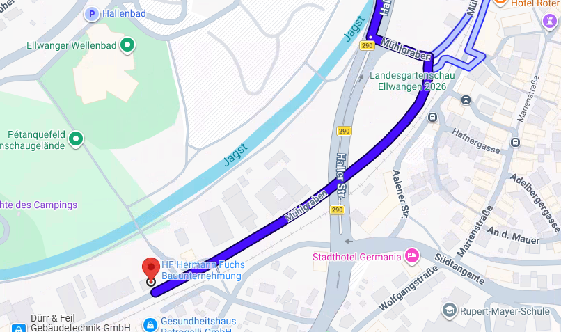 Unser Firmensitz befindet sich im „Industriegebiet Mühlgraben“ in zentraler Lage von Ellwangen. Sie erreichen uns bequem über die Westtangente: Biegen Sie in das „Industriegebiet Mühlgraben“ ein und anschließend rechts ab. Nach etwa 500 Metern geradeaus finden Sie unser Betriebsgelände auf der rechten Seite am Mühlgraben 46-48. Parkplätze sind natürlich vorhanden.