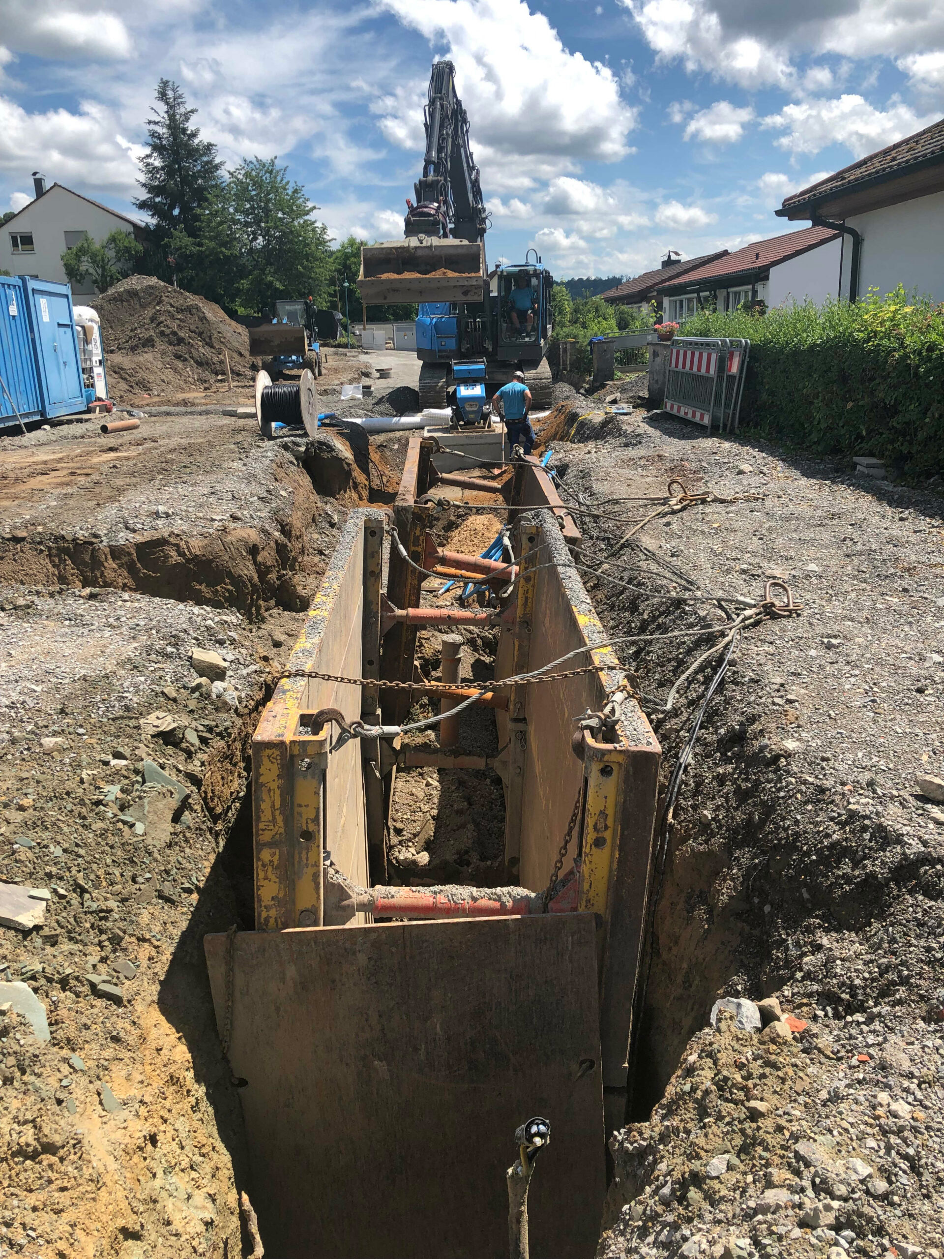 Erschließung des Baugebietes „Auf dem Bergle“Auf der Fläche eines ehemaligen Industriegebietes entstand in Südhanglage ein attraktives Wohngebiet mit 16 Grundstücken. Dazu führten wir die kompletten Kanalisations-, Leerrohreverlege- und Straßenbauarbeiten aus.